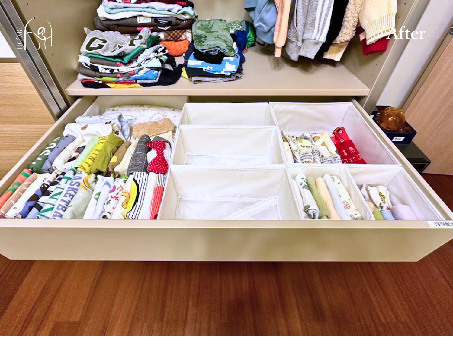 選用系統衣櫃作為儲物櫃,右半邊作為兒童衣物收納,由於孩子衣物短小,利用垂直空間使用兩根吊桿掛外套。抽屜則以「直立式摺衣法」收納小間的上衣、褲子。